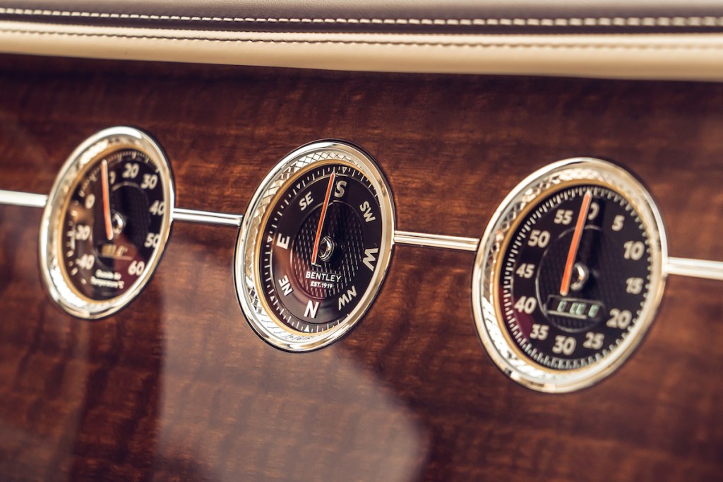 For those who like the bells and whistles, the optional Bentley Rotating Display is a must. Start the engine and a flat, veneered section of the fascia rotates to reveal the choice of 12.3-inch digital touchscreen which operates main functions of the car, including Apple and Android connectivity, sound system and climate control plus sat nav, 60gb hard drive, optional sirius satellite radio and Google street view. Rotate for analogue dials which are compass, temperature gauge and chronograph timer, or back to a plain wood veneer finish.